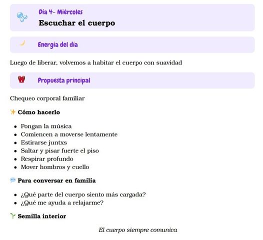 Cada día encontrarán propuestas sencillas como rituales, juegos, momentos creativos, espacios de descanso, charlas familiares y actividades para compartir desde el disfrute.